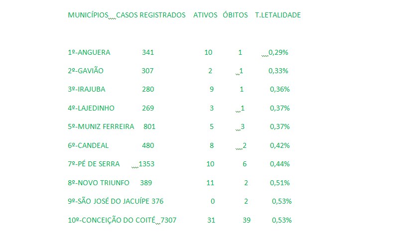 Nos 10 municípios com as menores taxas de letalidade em todo estado aparecem três que estão localizados no Território da Bacia do Jacuípe e dois no Território do Sisal. Gavião na Bacia do Jacuípe tem a segunda menor taxa do Estado, Coité está na 10ª posição – Confira tabela abaixo