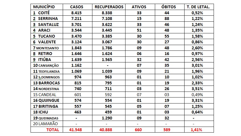 Veja o quadro atualizado. Lembrando que Queimadas não mostra a quantidade de casos registrados o que impossibilita a informação da taxa de letalidade, Candeal aparece com os números de 30 dias atrás por não ter atualizado e Lamarão assim como desde o inicio da pandemia aparece somente para constar que faz parte do território, já que não divulga boletim epidemiológico.
