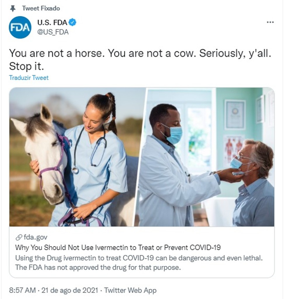 “Você não é um cavalo. Você não é uma vaca. Sério, pessoal, parem com isso”, afirmou a FDA na publicação, trazendo ainda um link para um posicionamento da agência, divulgado em maio deste ano, onde indica: “Por que você não deve usar ivermectina para tratar ou prevenir Covid-19”.