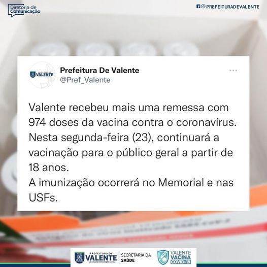 Falta pouco para todos municípios da Bahia, de modo especial do território do sisal concluir a vacinação do público adulto em geral. Alguns municípios já vacinaram pessoas com 18 anos ou mais e aguardam novos lotes para concluir a primeira dose ou dose única.