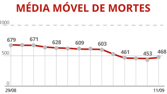 Em 31 de julho o Brasil voltou a registrar média móvel de mortes abaixo de 1 mil, após um período de 191 dias seguidos com valores superiores. De 17 de março até 10 de maio, foram 55 dias seguidos com essa média móvel acima de 2 mil. No pior momento desse período, a média chegou ao recorde de 3.125, no dia 12 de abril.