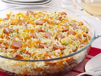 Em um refratário grande e de bordas altas coloque o arroz, o azeite, o alho, a cenoura, o alho-poró, a salsicha e o sal. Misture bem, despeje 4 xícaras (chá) de água fervente e cubra com papel-alumínio. Leve ao forno médio (200°C) por 15 minutos, mexa e volte por mais 10 minutos, ainda coberto com o papel-alumínio. Retire do forno e sirva.