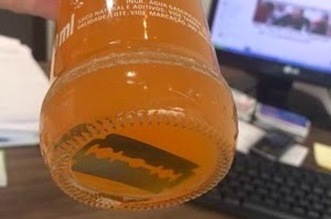 O funcionário público Alziro César afirma que sua filha encontrou uma lâmina de barbear no fundo de uma garrafa de Fanta Laranja, em um bar na cidade de Sorocaba, interior de São Paulo. Ele diz que entrará com ação contra a Sorocaba Refrescos, que produz o refrigerante na região. A empresa nega o fato. De acordo com César, sua filha, de 21 anos, trabalha em sua lanchonete quando ao servir o refrigerante a um cliente percebeu o objeto no fundo do recipiente. O fato aconteceu em meados de setembro e, desde então, a garrafa permaneceu fechada, segundo César. O advogado Anselmo Bastos, que deve representar César na ação, afirma que há casos semelhantes. "Há vários casos na internet se você for procurar", recorda. César afirma que procurou a companhia, que teria se comprometido a trocar o produto. Ele, porém, negou-se a realizar a troca. Procurada, a empresa afirmou que “seus processos de fabricação e rígidos protocolos de controle de qualidade e higiene tornam impossível que uma lâmina seja colocada em uma garrafa dentro de suas instalações fabris”. A companhia disse ainda que é certificada internacionalmente pelas normas ISSO 9001 (qualidade), ISSO 14001 (meio ambiente), OHSAS 18001 (segurança e saúde ocupacional) e FSSC 22000 (segurança dos alimentos). (Record)