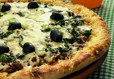 Modo de preparo: Numa panela, aqueça o azeite e doure levemente o alho. Junte a escarola e refogue rapidamente. Retire do fogo. Aqueça o molho de tomate e misture a carne moída. Despeje sobre o disco de massa. Por cima, disponha a escarola e polvilhe com a mussarela. Leve ao forno, preaquecido em temperatura alta, por dez minutos ou até o queijo derreter. Retire do forno, polvilhe com o orégano e coloque a azeitona. Sirva.