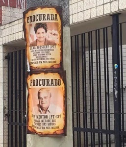 Cartazes espalhados por São Paulo provocaram mal-estar entre os membros do PT (Partido dos Trabalhadores). Os anúncios trazem fotos de Dilma Rousseff, Lula e ou petistas, apontando os políticos da legenda como “procurados”. O diretório estadual do partido anunciou que recorrerá à Justiça para pedir a apreensão dos cartazes. Em nota publicada na última quinta-feira (7), o PT-SP afirmou que os cartazes em questão foram afixados em postes e paredes da região central da capital e de algumas cidades do interior do Estado. O partido classificou os cartazes como “apócrifos e criminosos”, apontando uma “evidente motivação de causar danos e constrangimentos à imagem do PT e de seus representantes”. A legenda informou ainda que pedirá a instauração de uma investigação policial para identificar os responsáveis pelo patrocínio e distribuição dos anúncios. “O PT-SP repudia expedientes deste tipo, covardes e fascistas”, disse o diretório estadual. (Portal Terra)
