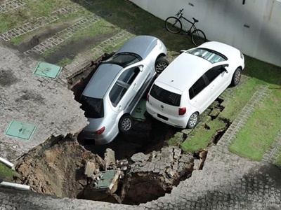 Piso cede, abre cratera e engole dois carros em residencial do Recife