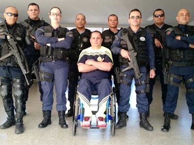 Um policial de Samambaia, no Distrito Federal, levou um tiro ao tentar prender, já fora do horário de trabalho, dois ladrões que assaltavam uma loja e ficou paraplégico. Mesmo com direito de se aposentar, ele escolheu seguir trabalhando. O sargento Helvio Pompilho é o único PM cadeirante do DF na ativa, segundo a corporação. Pompilho, de 43 anos, levou o tiro em março de 2012, quando saía do 11º Batalhão de Samambaia, próximo à quadra 416. Ao perceber o assalto, ele resolveu agir mesmo fora do horário de trabalho. “Quando os bandidos me viram já partiram para cima de mim. Quando tomei o tiro, já não sentia as minhas pernas, eu fiquei no chão esperando o socorro. Eles foram até mim para ver como eu estava e depois foram embora. Lembro que era um suspeito menor e o outro maior de idade”, disse Pompilho. O policial passou por cirurgia, em que foi constatada uma lesão medular. Ele passou três anos afastado do trabalho em decorrência do tiro, mas depois resolveu voltar ao trabalho na área administrativa. “Fui levado a uma junta médica que avalia a sua situação e ela pediu a minha reforma. Eu tive a opção de sair da polícia, mas escolhi ficar porque aqui eu me sinto útil, eu ainda posso produzir e agora eu vou ser promovido. Eu não queria sair antes dos 30 anos de serviço", disse Pompilho. O sargento trabalha no mesmo batalhão em que era lotado antes de ser baleado. Atualmente, ele está na área de comunicação social da PM. Ele atende demandas de veículos de comunição. O sargento Antonio de França, de 42 anos, diz que Pompilho é um “profissional diferenciado”. “Eu fico feliz que ele tenha retornado. Ele é um cara que trabalha e quer ajudar todo mundo. Ele ama a profissão dele e ama servir, é só conversar um pouco com ele que você já sente isso", afirma.
