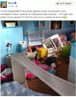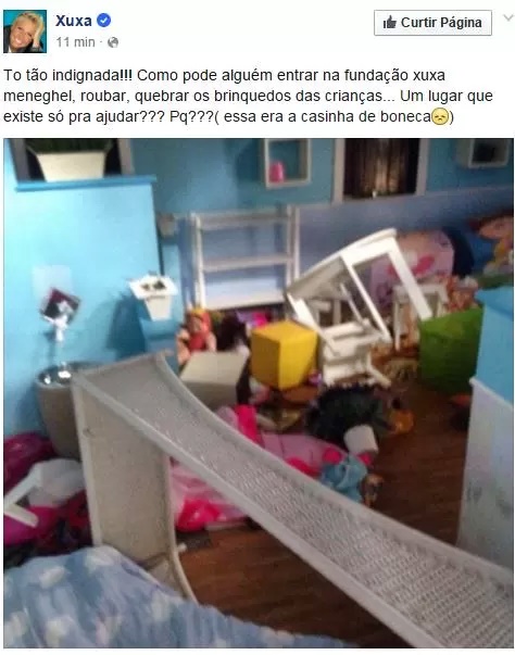 A apresentadora Xuxa Meneghel usou suas redes sociais na tarde desta terça-feira, 16, para compartilhar com seus fãs e seguidores a notícia de que sua fundação havia sido assaltada: "Tô tão indignada!!! Como pode alguém entrar na fundação Xuxa Meneghel, roubar, quebrar os brinquedos das crianças. Um lugar que existe só pra ajudar??? Pq???", escreveu ela na legenda da foto. A Fundação Xuxa Meneghel tem 27 anos de existência, atende crianças e adolescentes em situação de vulnerabilidade social, e fica localizada no bairro de Guaratiba, na Zona Oeste do Rio.