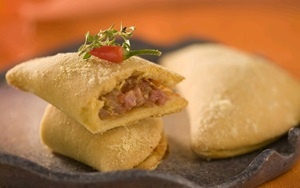 Para o recheio: Em uma panela frite a linguiça e o presunto na manteiga. Junte a cebola e refogue, sem parar de mexer, até murchar. Acrescente o tomate picado e o sal. Ao encorpar um pouco, retire do fogo e deixe esfriar. Reserve.