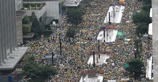 Diferente do que propaga o PT e os ministros do governo Dilma, pesquisa realizada na Avenida Paulista no último domingo (13), durante o maior protesto popular da História, revela que mais de um terço (ou 34,5%) dos manifestantes disseram já ter votado do PT. A rejeição a Dilma foi quase unânime: 90,3% dos pesquisados classificaram o governo como ruim (10,5%) ou péssimo (79,8%). Ótimo e bom, 4,2%. Para 19,7% Dilma chegará ao fim do mandato; 45,2% acreditam em impeachment e 28,8% acham que a Justiça afastará Dilma do cargo. Segundo a pesquisa, 86,3% dos manifestantes preferem que Dilma renuncie ao cargo. Apenas 11,1% acham que ela deve ficar. Entre os manifestantes, 73,8% revelaram que a situação econômica de suas famílias piorou nos últimos 6 meses e 55,8% perderam empregos. Foram entrevistados 1.200 pessoas, entre 12h30 e 18h do dia 13 de março, com 3% de margem de erro, segundo o Paraná Pesquisa (Bocão News)