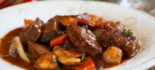 Tempere os cubos de acém com sal, pimenta-do-reino moída na hora e azeite de oliva. Passe na farinha de trigo e retire o excesso, reserve. Descasque as batatas e corte em pedaços de 3 cm, reserve em água para não escurecer. Descasque as cenouras e corte em rodelas com 2 cm de espessura, reserve. Numa panela de fundo grosso devidamente aquecida coloque o azeite de oliva e doure ligeiramente os cubos de acém, vá reservando os cubos já dourados. Na mesma panela coloque um pouco mais de azeite de oliva e refogue as cebolas picadinhas até que fiquem douradas, junte o alho, as folhas de louro cortadas em tirinhas, os dentes de alho esmagados e picados, as folhas de manjerona, as folhas de salsinha.Adicione a cerveja preta e deixe ferver para evaporar o álcool. Junte os tomates, a carne de acém douradas, as batatas, as cenouras, os cogumelos e o caldo de carne. Deixe levantar fervura, prove os temperos e ajuste se julgar necessário. Cozinhe a carne com a panela tampada em fogo médio-baixo por 45-60 minutos. Sirva quente.