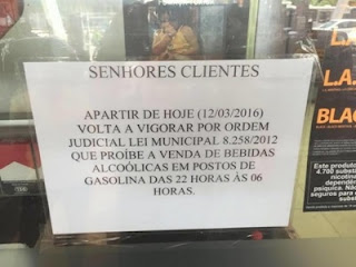 Agora é pra valer. A lei que proíbe a venda de bebidas alcoólica em postos de combustível de Salvador volta a vigorar. De autoria do presidente da Câmara Municipal, o vereador Paulo Câmara (PSDB), a lei 8,258/2012 restringe a venda de bebidas alcoólicas em postos de combustíveis após 22 horas. Em Salvador, um mandato de segurança em caráter liminar impetrado na Justiça pelo Sindicato do Comércio de Combustíveis, Energias Alternativas e Lojas de Conveniência do Estado da Bahia (Sindicombustíveis) impediu a execução desta lei em 2013. Entretanto, o vereador venceu a batalha na Justiça e derrubou a liminar. Postos já estão anunciando a nova regra, que já está está valendo.