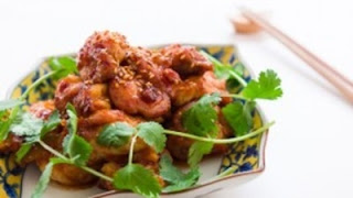 Corte o frango em pedaços pequenos e tempere com um pouco de sal. Combine o xarope de bordo, molho de soja, molho picante, vinho branco e gengibre e misture. Coloque o frango em uma frigideira antiaderente e cozinhe em fogo médio. Uma vez que o frango esteja dourado de um lado, cire e doure o outro lado. Adicione o molho, e aumente o fogo até ferver. Retire da panela, decore com coentro e sirva com arroz.
