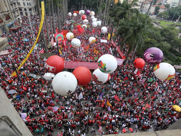 Os manifestantes dizem que a cassação do mandato de Dilma configura um golpe e pedem a defesa da democracia. A concentração começou por volta das 16h e, segundo os organizadores, a manifestação deve permanecer na Praça da Sé. Não há previsão de passeata. Além da Praça da Sé, os manifestantes tomaram a rua Benjamin Constant. Por volta das 19h, o Metrô fechou a entrada próxima ao Poupa tempo da estação Sé, da Linha 1-Azul, depois que começou a chover na região. Segundo a companhia, um grande número de manifestantes buscou refúgio dentro da estação, atrapalhando os usuários do serviço. Presidente do PT estadual, Emídio de Souza discrusou em carro de som e criticou Eduardo Cunha e Michel Temer. "O Mar Vermelho no Brasil vai se fechar para impedir os golpistas", disse. Antes dele, o ex-jogador de futebol Wladimir, famoso por passagens em clubes como Corinthians, Cruzeiro e Santos, também discursou. Ele lembrou-se de quando subiu ao palco de um dos comícios das Diretas Já, ao lado de Sócrates e Casagrande em 1984. "O ato é importante para preservar a participação popular no nosso governo. Reiterar a democracia sempre. O poder emana do povo e por ele deve ser exercido. Temos de cumprir à risca", disse Wladimir.