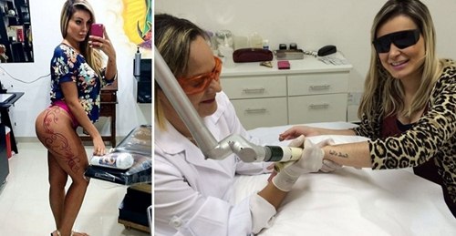 Andressa Urach mudou completamente sua vida. Há um ano, após passar por uma grave infecção por conta da aplicação de hidrogel, a ex-modelo se converteu à religião evangélica. Agora, mais uma mudança: ela resolveu remover suas tatuagens [foto à dir.]. Aos poucos, Urach pretende apagar todos os desenhos. "Primeiro queria ver se eu iria aguentar a dor, porque há uns anos tentei tirar e doeu muito, mas essa técnica [a laser] eu amei porque não dói. O tempo passou e comecei a me sentir suja, poluída esteticamente com esse monte de desenho sem sentidos no meu corpo", declarou. Na montagem acima, uma imagem antiga de Urach. (Bol)