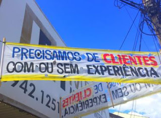 Um empresário da cidade de Goiânia decidiu ser bem direto na propaganda de sua loja de móveis. Para combater a crise econômica, ele colocou uma faixa na frente do estabelecimento com a frase “precisamos de clientes com ou sem experiência”. Segundo Valdeir Oliveira de Souza, a brincadeira não só arranca risadas de pessoas que passam pelo local, como também fizeram aumentar os lucros. “Eu vi essa frase em uma postagem na internet e resolvi colocar aqui para brincar um pouco. As pessoas buzinam, acham graça e muitos que param acabam entrando na loja e fechando negócio. Aumentamos as vendas bastante dentro da medida do possível”, explica em entrevista ao G1. A loja faz parte de uma rede com quatro unidades na capital de Goiás. Apesar do momento ruim na economia do país, Valdeir pretende abrir uma quinta loja ainda este ano. Para ele, a situação atual é passageira e melhor do que em 1985, quando ele começou a trabalhar no ramo. "Hoje não estamos em uma boa fase, mas a estrutura do país é outra, o mercado consumidor é outro”, afirma.