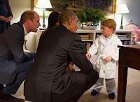 Príncipe Gerge roubou a cena mais uma vez. Segundo informações da revista "People", o menino apareceu de surpresa durante o encontro do presidente Obama com seu pai, o Príncipe William. Ainda estavam presentes a duquesa Kate Middleton e Michelle Obama. "Príncipe George encontra com o presidente e a primeira dama dos Estados Unidos", publicou o perfil oficial do palácio real. Eles informaram ainda que George agradeceu o cavalo de pau de balanço que Obama lhe deu quando ele nasceu. O menino estava uma fofura vestindo um roupão e seu pijama. Fontes de revista "People" informaram que George ficou algumas minutos e que a princesa Charlotte estava na cama. A visita de Obama e Michelle a William e Kate faz parte da agenda presidencial. Está programado ainda um jantar dos dois casais, com a presença do Príncipe Harry.