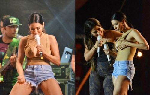 Simaria, da dupla com Simone, fez a alegria dos fãs na cidade de Limoeiro, no Pernambuco, principalmente dos marmanjos de plantão. A cantora acabou mostrando demais em cima do palco ao dançar usando um short jeans cavado. Além do shortinho, a forrozeira apresentou um decote bastante generoso e ainda foi traída pelo frio, o que gerou brincadeiras da irmã Simone em cima do palco. "Minha irmã, desligue esses faróis", disse. Simaria não demorou a responder "Tenho que exibir eles agora, quando ficar velha eles vão bater nos pés", rebateu, segundo o portal Ego.