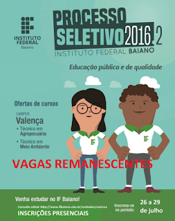 Estão disponíveis 12 (doze) vagas para o curso de Agropecuária vespertino e 16 (dezesseis) para o curso de Meio Ambiente matutino. O IF Baiano conta com reserva de vagas para oriundos de escola pública e pessoas com deficiência. A seleção será feita através de análise do histórico escolar do Ensino Médio ou através do certificado de conclusão do Ensino Médio através do ENEM. O resultado está previsto para o dia 03 de agosto e as matrículas para os dias 04 e 05 de agosto. Mais informações consulte o edital no site:http://www.ifbaiano.edu.br/unidades/valenca/ ou ligue para o telefone: 3641 – 5270. *Ascom