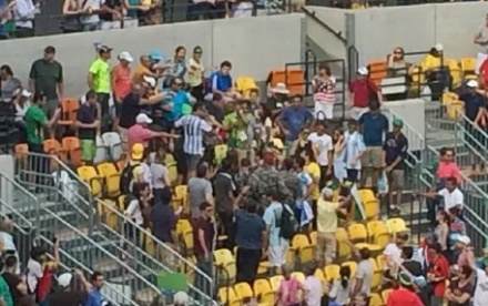 A rivalidade entre brasileiros e argentinos apareceu logo nos primeiros minutos da partida entre Juan Martin Del Potro e João Sousa, nesta segunda-feira à tarde, pela segunda fase do torneio de simples da Olimpíada. Dois torcedores se provocaram durante uma das pausas e trocaram socos na arquibancada. Militares entraram no jogo, que foi paralisado, e retiraram os dois. O gringo deixou a quadra central mandando beijos e provocando quem o vaiava.A confusão aconteceu ao fim do segundo game do primeiro set, quando o placar apontava um empate em 1 a 1. Os argentinos aumentaram o coro de apoio a Del Potro e alguns brasileiros rebateram com vaias. Dois homens, então, se desentenderam de forma mais dura e trocaram xingamentos. O argentino partiu para cima e acertou um soco no brasileiro, que revidou. A briga durou pouco, mas a partida precisou ser interrompida (os tenistas até saíram de quadra).