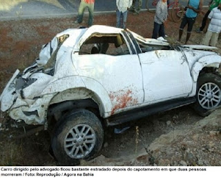 Duas pessoas morreram e uma ficou ferida em um acidente na BA 148, trecho entre São Gabriel e Jussara, centro Norte do Estado, perto da cidade de Irecê. De acordo com a Polícia Rodoviária, o carro conduzido pelo advogado Lucas Borges Braga de Aguiar, saiu da pista e capotou, quando passava pela localidade conhecida por Curva dos Coqueiros. Duas pessoas que viajavam na carona do automóvel morreram na hora. O advogado foi socorrido por uma equipe do Serviço de Atendimento Móvel de Urgência (Samu) para o Hospital Regional de Irecê onde está internado. Não há informações oficiais sobre o estado de saúde dele, mas testemunhas dizem que ele sofreu ferimentos leves. Os corpos das duas pessoas que morreram e que não tiveram identidade revelada, foram encaminhados ao Instituto Médico Legal (IML) de Irecê por uma equipe do Departamento de Polícia Técnica – DPT.(Agora na Bahia)