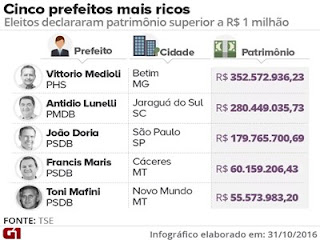 Entre os mais de 5,5 mil prefeitos eleitos nas eleições municipais deste ano há 1,1 mil milionários, segundo levantamento do G1 junto aos dados do Tribunal Superior Eleitoral (TSE). Ou seja, um em cada cinco eleitos para comandar as prefeituras a partir de 2017 declara possuir patrimônio superior a R$ 1 milhão. O mais rico é Vittorio Medioli (PHS), que irá comandar a cidade de Betim (MG). Em seguida, aparece Antidio Lunelli (PMDB), futuro prefeito de Jaraguá do Sul (SC). Em terceiro lugar está João Doria (PSDB), que venceu no primeiro turno na capital paulista. Do total, 55 declaram possuir patrimônio superior a R$ 10 milhões e, destes, 29 dizem possuir mais de R$ 20 milhões. A maioria está em Minas Gerais, estado que tem 161 prefeitos milionários eleitos. Em seguida, aparecem São Paulo, com 137, Rio Grande do Sul, com 85, Paraná, com 83, Bahia, com 80, Goiás, com 73, e Mato Grosso, com 63. Das 26 capitais brasileiras, 11 serão governadas por milionários. São elas: Belém (Zenaldo Coutinho, do PSDB); Belo Horizonte (Kalil, do PHS); Campo Grande (Marquinhos Trad, do PSD); Cuiabá (Emanuel Pinheiro, do PMDB); Goiânia (Iris Rezende, do PMDB); João Pessoa (Luciano Cartaxo, do PSD); Natal (Carlos Eduardo, do PDT); Palmas (Carlos Amastha, do PSB); Porto Velho (Dr. Hildon, do PSDB); Salvador (ACM Neto, do DEM); e São Paulo (João Doria, do PSDB). Entre os partidos, os que mais conseguiram eleger prefeitos milionários foram PSDB (206), PMDB (205), PSD (107), PP (81), PSB (79), PDT (66), PR (60), DEM (53), PTB (49), PT (32) e PV (29).