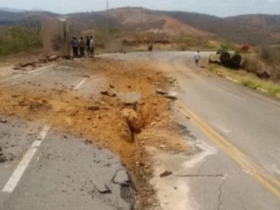 Uma carreta bitrem carregada de pedras de mármore capotou na manhã desta quarta-feira (02), na BA-262, na altura da comunidade de Jibóia, em Caraíbas, no sudoeste baiano. Segundo informações do site Brumado Notícias, as pedras da carga caíram no asfalto, abrindo uma cratera na pista e afetando o tráfego no trecho, que apresenta uma curva em uma região de serra. Com os danos após o acidente, os condutores precisam ficar atentos ao trafegar na rodovia. A Polícia Rodoviária Estadual está no local para monitorar o fluxo de veículos e investigar as causas do capotamento.
