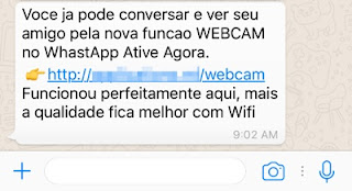Um novo golpe no WhatsApp utiliza o recém-lançado recurso de videochamada para enganar os usuários que ainda receberam a novidade. As informações são das Kaspersky Lab. Segundo a empresa de segurança, o ataque é focado nos donos de iPhone, uma vez que esse recurso de videochamada já está disponível para usuários Android. Como costuma acontecer em golpes desse tipo, a campanha falsa envia um link malicioso para o usuário, que ele precisa compartilhar via mensagem com 3 grupos ou 10 contatos no app antes de ser direcionado para o download de softwares de origem duvidosa.
