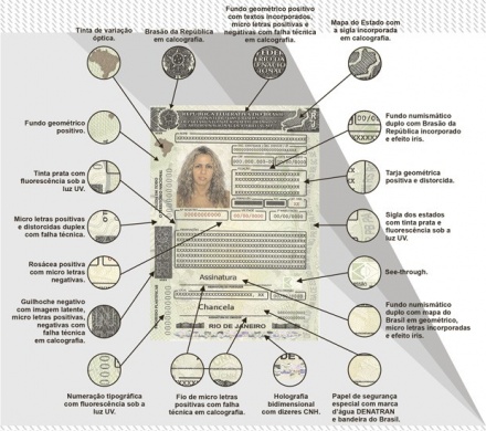 No alto do lado esquerdo, sob o brasão da República, a imagem do mapa do Brasil passa a ser impressa com tinta especial de segurança, que também dificulta a falsificação. Todo o fundo do documento ficou mais amarelado e alguns elementos gráficos, como números, poderão ser conferidos com o uso de luz ultravioleta. O documento ganhará brasões da República impressos que só serão vistos com o uso de luz negra. Na parte de baixo, haverá uma holografia com a sigla CNH impressa repetidas vezes. Além disso, aparecem novos fios de microletras que também servem para dificultar falsificações.