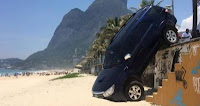 Filho de atores esquece de puxar freio de mão e carro fica pendurado em praia