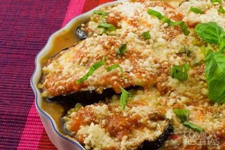 Faça primeiramente o molho, refogando o alho e a cebola no azeite. A seguir, acrescente a polpa de tomate, o manjericão e a pimenta e cozinhe, mexendo de vez em quando, por cerca de 10 minutos, até formar o molho. Em uma fôrma, coloque 1 xícara (chá) do molho e acrescente as rodelas de berinjela. Espalhe as fatias de mussarela por cima e cubra com o restante do molho. Polvilhe o queijo parmesão e asse, em forno médio, por cerca de 40 minutos ou até que a berinjela esteja macia. Sirva em seguida. (ComidaeReceitas)