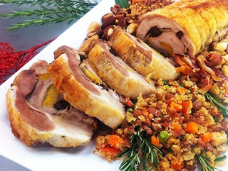 Lombo: Corte o lombo como se fosse um rocambole. Abra a carne e tempere com alho, sal, pimenta e alecrim. Coloque o damasco, a ameixa e a maçã, e regue com um pouco de azeite. Por último, acrescente o bacon. Enrole a peça e feche com um barbante. Jogue suco de laranja, limão e cerveja por cima. Se você quiser, coloque alecrim e folhas de louro. Leve ao forno por aproximadamente 2 horas. Corte a carne fria.