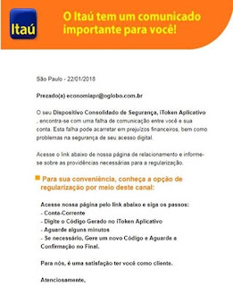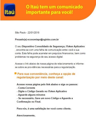 Criminosos também estão usando um e-mail como armadilha para roubarem dados de clientes do Itaú. A mensagem enviada pelos golpistas afirma que o Dispositivo Consolidado de Segurança iToken Aplicativo encontra-se com uma falha de comunicação com a conta. Segundo o e-mail, esta suposta falha poderia acarretar em prejuízos financeiros, bem como problemas na segurança do acesso digital. Após a mensagem, há um link que supostamente serviria para acabar com a questão. Procurado, o Itaú ressaltou que nunca envia e-mail, SMS nem telefona a seus clientes solicitando senhas, códigos do iToken e/ou dados pessoais. “Especificamente sobre o recebimento desse e-mail, tanto o remetente quanto o link demonstram se tratar de um e-mail falso, enviado na tentativa de realizar transações fraudulentas com o uso dos dados de agência, conta, senha e códigos iToken informados pelos clientes”. A instituição orienta a não clicar no link e enviar o mesmo e-mail para email.suspeito@itau-unibanco.com.br.
