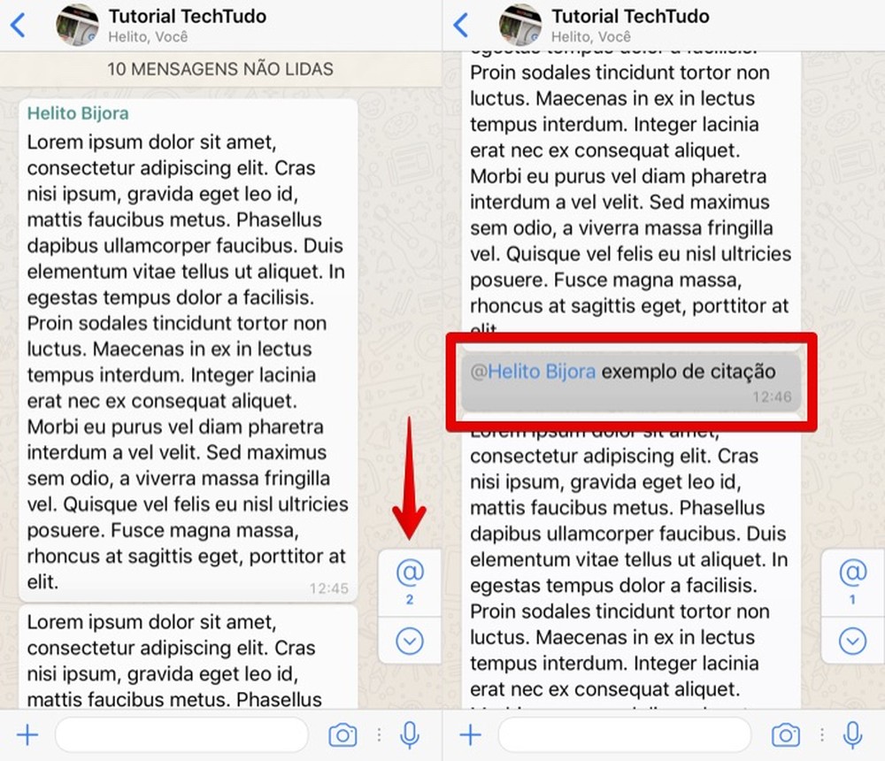 Passo 1. Após atualizar o seu WhatsApp, abra um grupo com mensagens não lidas e verifique o botão "@", na lateral direita da tela. Ele só aparece caso alguém o tenha citado ou respondido. Toque sobre o botão para ser levado diretamente à mensagem.
