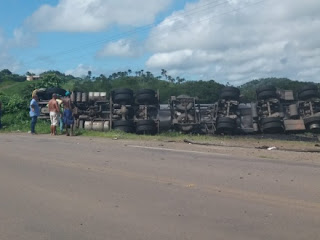 Caminhão carregado com líquido inflamável tomba na BA-046, próximo a Nazaré das Farinhas