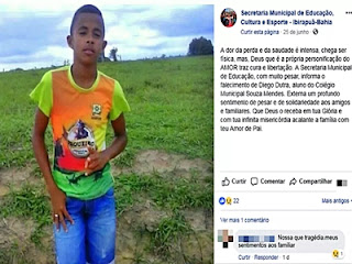 "A dor da perda e da saudade é intensa, chega ser física, mas, Deus que é a própria personificação do AMOR traz cura e libertação. A Secretaria Municipal de Educação, com muito pesar, informa o falecimento de Diego Dutra, aluno do Colégio Municipal Souza Mendes. Externa um profundo sentimento de pesar e de solidariedade aos amigos e familiares. Que Deus o receba em tua Glória e com tua infinita misericórdia acalante a família com teu Amor de Pai". (G1)