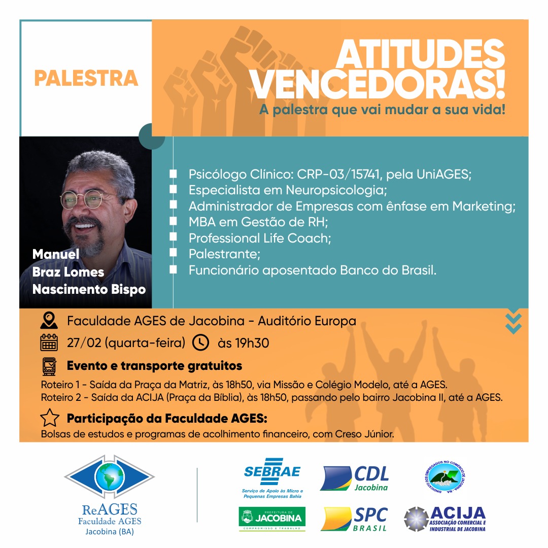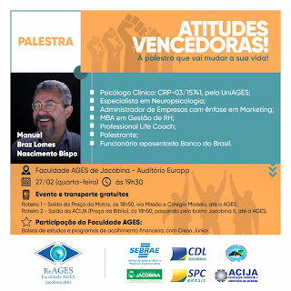 Pensando nisso, a Faculdade AGES de Jacobina, em parceria com o SEBRAE, a CDL Jacobina, a ACIJA, o Sindicato dos Empregados, a Prefeitura de Jacobina e a SPC Brasil realizará uma palestra na próxima quarta-feira, 27/02, às 19h30, com o psicólogo clínico, neuropsicólogo e administrador de empresas Manoel Braz Lomes Nascimento Bispo.