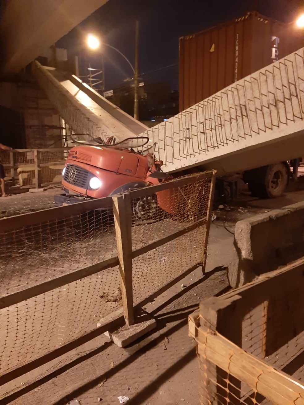 Segundo o consórcio Transbrasil, responsável pelas obras no local, um caminhão carregando um contêiner atingiu a estrutura de um viaduto que está sendo montado na parte baixa da Avenida Transbrasil, na altura de Coelho Neto. O choque teria provocado o desabamento da estrutura sobre o veículo.