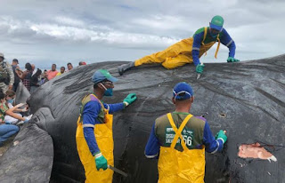 Pesando 39 toneladas e medindo 14 metros de comprimento, o corpo da baleia começou a ser removido por equipes da Limpeza Urbana de Salvador (Limpurb). Contudo, moradores do Subúrbio Ferroviário também começaram a fatiar o animal, parcialmente apodrecido.