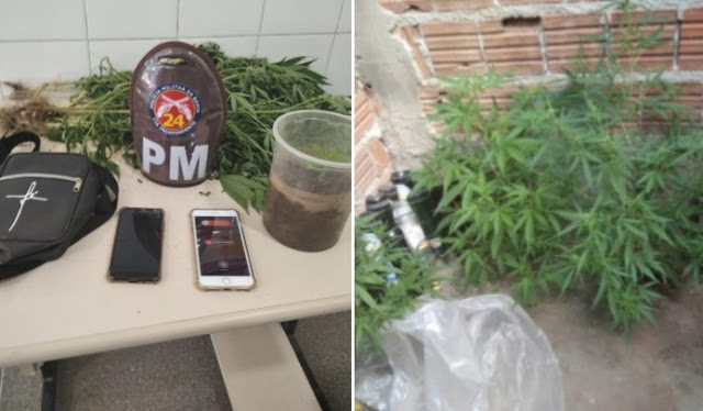 Ao chegarem no endereço, os policiais foram atendidos pela proprietária da residência. A mulher, após ser questionada sobre o fato, informou que a plantação pertencia a seu filho, um menor de 16 anos, e que ele estava no quintal da casa com mais dois indivíduos maiores de idade. Um dos suspeitos é foragido do presídio de Juazeiro. No local, foram encontrados 10 pés de maconha, uma muda da erva e 02 aparelhos celulares.