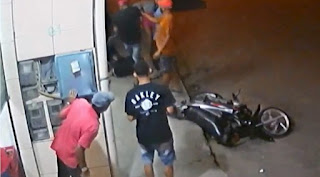 Ele foi então atrás dos jovens, que estacionaram a moto e entraram na hamburgueria da família de um deles. Imagens de câmeras de segurança flagraram toda a ação. O PM chegou no local e começou a discutir. Ele dá um soco no rapaz, que revida.