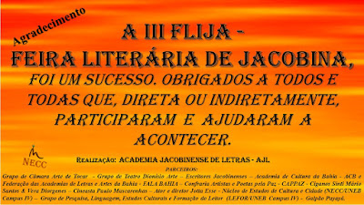 A AJL – Academia Jacobinense de Letras, realizou durante os dias 19, 20 e 21 de setembro, a III FLIJA – Feira de Literatura de Jacobina. O evento foi um sucesso e contou com um bom público. Durante os três dias de programação, aconteceram várias atividades artísticas culturais, a exemplo da Mesa Redonda “Fotografia e imprensa no sertão: Olhares e escritas nas pesquisas sobre Jacobina”, apresentada pelo Professor/Doutor Valter Oliveira do Núcleo de Estudos de Cultura e Cidade - NECC/UNEB Campus IV; Contação de Histórias, promovido pelo Grupo de Pesquisa, Linguagem, Estudos Culturais e Formação do Leitor - LEFOR/UNEB Campus IV, coordenado pela Professora/Doutora Denise Dias; Palestra “Trajetória de Itapeipu pra Salvador com escala em Jacobina” , proferida pelo membro da Academia de Cultura da Bahia e Membro da CAPPAZ - Confraria Artistas e Poetas pela Paz, Antônio Luiz Moreira de Oliveira, jacobinense conhecido como Cardoso; Palestra “Movimento Acadêmico nos Municípios Baianos”, proferida pelo advogado e escritor Benjamin Batista de Macedo Filho, Presidente da Academia de Cultura da Bahia (ACB) e da Federação das Academias de Letras e Artes da Bahia (FALA BAHIA); Papo Literário com escritores jacobinenses, apresentação teatral, com as peça “O Auto da Compadecida” apresentada pelo Grupo Dionísio Artes; apresentação musical com o Grupo de Câmara Arte de Tocar com o maestro Jal Nunes e a instrumentista Lua Nunes; Mostra fotográfica coletiva “Os rios em Jacobina: entre olhares e vivências” com fotógrafos do Projeto de Extensão Aprendendo com os Rios; lançamento do Jornal “A Letra” edição 53; Cultura e Dança Cigana, com os Ciganos Sinti Mário Santos e Vera Diorgenes; apresentação do documentário “A História do Teatro – Memórias das Artes Cênicas em Jacobina”, seguida de mesa redonda o cineasta Paulo Mascarenhas, o ator e diretor Jotta Esse e o Sarau Galpão Payayá, Homenageando as autoras Conceição Evaristo e Elisa Lucinda e com os lançamentos dos livros “Poesia e Texto Livre” do escritor Leo Resende, “Com amor e rebeldia se faz poesia” do escritor jacobinense Maicon Douglas.