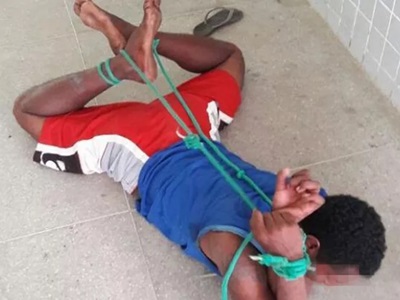 Sem algemas em delegacia, policiais usam corda para amarrar suspeito