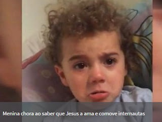 Uma criança de dois anos de idade chorando é o viral da semana nos Estados Unidos. O motivo da emoção é por que ela descobre que Jesus Cristo a ama. Ella Grace Pierce, da Virgínia, aprendeu a orar quando tinha apenas um ano de idade e sempre amou a Jesus, garante a mãe dela Emily Bannard. A pequena muitas vezes até pede que Ele venha visitá-la. Emily disse que Ella “está sempre falando sobre seu amor por Jesus. É algo realmente tão doce e que faz meu coração tão feliz”. Conta ainda que a família é evangélica e sempre teve uma fé “muito forte”. “Ella faz uma oração todas as noites antes de dormir e nunca nos deixa esquecer disso”, garante a mãe. O vídeo foi postado despretensiosamente e, como quase todo viral, ganhou popularidade sem que o autor saiba direito por que. O sucesso instantâneo da menininha foi notícia em vários jornais no mundo. “Ela começou a orar quando tinha apenas um ano. Ela viu um garotinho no parque que estava chorando e pediu para orar por ele”, relata Emily. Destacou ainda que a filha gosta de cantar canções sobre Jesus. Com informações Daily Mail