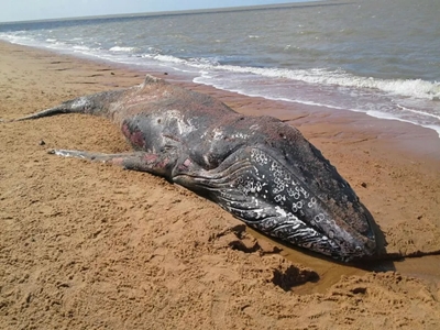 Uma baleia jubarte foi encontrada morta na manhã desta segunda-feira (26), na praia Ponta da Baleia, em Caravelas, no sul da Bahia. Esta é a segunda baleia encontrada morta na região em quatro dias. Na última quinta-feira (22), outra baleia foi encontrada morta, também em uma praia do sul do estado, mas na região de Alcobaça. A baleia encontrada nesta segunda-feira é uma juvenil de baleia jubarte, segundo informações do projeto Baleia Jubarte, que protege os animais na região. O projeto ainda não tem o tamanho exato da baleia, mas informou que deve ter 7,5 a 8 metros de comprimento. Também não há detalhes se o animal é macho ou fêmea. (G1)