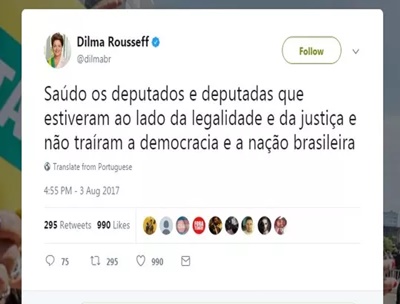 A ex-presidente Dilma Rousseff lamentou no Twitter, a rejeição da denúncia contra o presidente Michel Temer. Dilma também aproveitou a rede social para dizer que o governo sofre influência do deputado cassado Eduardo Cunha (PMDB-RJ). Ao analisarem a denúncia da Procuradoria Geral da República contra Temer, pelo crime de corrupção passiva, os deputados rejeitaram o prosseguimento do processo para o Supremo Tribunal Federal por 263 votos a 227. “Saúdo os deputados e deputadas que estiveram ao lado da legalidade e da justiça e não traíram a democracia e a nação brasileira. […] Resta-nos continuar lutando contra a pauta regressiva dos golpistas que serão julgados pela história e condenados pelo voto popular”, publicou a ex-presidente no Twitter. Dilma sofreu o impeachment no ano passado. O processo foi aberto em dezembro de 2015 por Eduardo Cunha, então presidente da Câmara. Na Casa, em abril de 2016, 367 deputados votaram a favor do prosseguimento do processo contra ela para o Senado. A ex-presidente citou, ainda, o senador Renan Calheiros (PMDB-AL), que faz oposição a Temer, para afirmar que o governo do peemedebista é influenciado por Cunha. Renan também tem dito isso. “Razão tem o senador Renan [Calheiros] em dizer que Eduardo Cunha governa desde a prisão de Curitiba”, afirmou Dilma. (Globo)