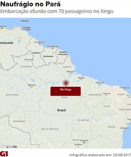 Uma embarcação naufragou na madrugada desta quarta-feira (23) em uma área denominada de Ponte Grande do Xingu, entre as cidades de Porto de Moz e Senador José Porfírio, no sudoeste do Pará. Segundo a Secretaria de Estado de Segurança Pública e Defesa Social (Segup), já foram encontrados sete corpos de vítimas do naufrágio. O navio “Comandante Ribeiro” saiu do município de Santarém, oeste do estado, com cerca de 70 pessoas a bordo. A embarcação tinha escala nos municípios de Monte Alegre, Prainha e destino final em Vitória do Xingu. Até às 10h, apenas 25 vítimas do naufrágio chegaram à margem do rio com vida. De acordo com a Segup, trabalham no resgate das vítimas do naufrágio as Defesas Civis Municipais de Belém, Senador José Porfírio e Vitória do Xingu. A Polícia Civil já investiga as causa do naufrágio. (G1)
