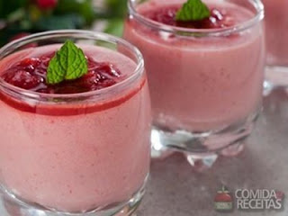 Modo de preparo: Faça a mousse: bata no liquidificador os morangos junto com o suco e o adoçante até virar um purê. Hidrate a gelatina em 3 colheres (sopa) de água e a derreta em banho-maria ou no micro-ondas por 15 segundos, na potência média. Misture-a ao purê de morangos junto com o creme de leite. Mexa bem. Acrescente as claras delicadamente ao creme de morangos, mexendo com uma espátula com movimentos de baixo para cima (dessa maneira a mousse ficará bem aerada). Despeje a mousse em 10 taças e leve à geladeira por pelo menos 4 horas, para firmar. Faça a calda: leve todos os ingredientes ao fogo baixo, mexendo de vez em quando, por cerca de 5 minutos, ou até formar uma calda rala. Deixe esfriar e despeje por cima da mousse já firme. Sirva gelado. (ComidaeReceitas)