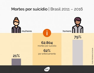 Cerca de 11 mil pessoas morrem por suicídio todos os anos no Brasil. De acordo com o primeiro boletim epidemiológico sobre suicídio, divulgado hoje (21) pelo Ministério da Saúde, entre 2011 e 2016, 62.804 pessoas tiraram suas próprias vidas no país, 79% delas são homens e 21% são mulheres. A divulgação faz parte das ações do Setembro Amarelo, mês dedicado à prevenção ao suicídio. A taxa de mortalidade por suicídio entre os homens foi quatro vezes maior que a das mulheres, entre 2011 e 2015. São 8,7 suicídios de homens e 2,4 de mulheres por 100 mil habitantes. Para a diretora do Departamento de Vigilância de Doenças e Agravos Não-Transmissíveis e Promoção da Saúde, Fátima Marinho, esse número é maior pois há uma perda de diagnóstico dos casos de suicídio. Segundo ela, nas classes sociais mais altas há um tabu sobre o tema, questões relacionadas a seguros de vida e diagnósticos feitos por médicos da família. “As pessoas mais pobres, em geral, captamos a morte porque ele vai pro IML [Instituto Médico Legal]”, explicou. Das 1,2 milhão de mortes, em 2015, 17% tiveram causa externa. Dessas 40% são registradas por causas não determinadas, segundo Fátima. “Ainda tem 6% de mortes que ainda não conseguimos chegar na causa. São cerca de 10 mil mortes que foram por causa externa, violenta, mas não sabe porquê. Por isso temos esse subdiagnostico do suicídio”, disse. No Brasil, os idosos, de 70 anos ou mais, apresentaram as maiores taxas, com 8,9 suicídios para cada 100 mil habitantes, mas, segundo Fátima, em números absolutos, a população idosa vem aumentando. Além disso, eles sofrem mais com doenças crônicas, depressão e abandono familiar. Ela explica que esse índice alto de suicídio entre idosos é observado no mundo todo. Os dados apontam que 62% dos suicídios foram causados por enforcamento. Entre os outros meios utilizados estão intoxicação e arma de fogo. Fátima conta que nos Estados Unidos são registrados mais suicídios por armas de fogo porque o acesso é mais facilitado. A proporção de óbitos por suicídio também foi maior entre as pessoas que não têm um relacionamento conjugal, 60,4% são solteiras, viúvas ou divorciadas e 31,5% estão casadas ou em união estável. “E os homens casados se suicidam menos. O casamento é um fator de proteção para os homens e de risco para as mulheres”, disse Fátima, explicando que existe uma associação das tentativas de suicídio das mulheres com a violência intradomiciliar. Ela compara que as mulheres tentam mais e, por outro lado, os homens anunciam menos, mas são os que mais morrem por suicídio. Entre 2011 e 2015, a taxa de mortalidade por suicídio no Brasil foi maior entre a população indígena, sendo que 44,8% dos suicídios indígenas ocorreram na faixa etária de 10 a 19 anos. A cada 100 mil habitantes são registrados 15,2 mortes entre indígenas; 5,9 entre brancos; 4,7 entre negros; e 2,4 morte entre os amarelos. Para Fátima, o alto risco de suicídio entre jovens indígenas compromete o futuro dessas populações, já que elas também há um alto risco de mortalidade infantil. Segundo a secretaria especial de Saúde Indígena, Lívia Vitenti, existe um número alto de indígenas em sofrimento por uso álcool, disputas territoriais e conflitos com a família e com a população não indígena. Entre os jovenes, então, há falta de perspectivas de vida. Entretanto, o problema do suicídio indígenas não está distribuído por todo o território, sendo mais frequente entre os Guarani Kaiowá, Carajás e Ticunas.