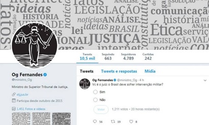 O ministro Og Fernandes, do Superior Tribunal de Justiça (STJ), abriu uma consulta pública inusitada em sua conta no Twitter. “Vc é o juiz: o Brasil deve sofrer intervenção militar?” Responderam à pesquisa do magistrado 37.077 internautas. Desse universo, 49% disseram “Sim” a uma intervenção. E 51% rechaçaram a volta dos tanques às ruas. Og é ministro do STJ desde 2008. Ele é graduado em Direito pela Universidade Federal de Pernambuco e em jornalismo pela Universidade Católica em 1974. Entre 1973 e 1981 – era o auge da repressão militar no País, governos dos generais Emílio Médici, Ernesto Geisel e João Figueiredo – ele foi repórter do jornal Diário de Pernambuco. Em 1975 foi professor auxiliar de história no Colégio Militar do Recife. Exerceu a advocacia na área criminal de 1977 a 1981. Foi assessor de gabinete da Secretaria da Justiça de Pernambuco em 1978 e assessor jurídico do sistema penitenciário do Estado. Ingressou na magistratura em 1981. Em 1997 foi promovido a desembargador do Tribunal de Justiça de Pernambuco, Corte que presidiu em 2008 – naquele ano foi nomeado ministro do STJ. (O Globo)